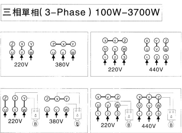 上面的圖分別是普通的三相380,220V和三相440,220V的接線方式。下面的圖分別是帶剎車的三相380,220V和三相440,220V的接線方式。