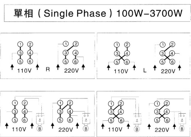 上面的圖R是齒輪減速機出軸向右轉的接線方式,圖L則是齒輪減速機出軸向左轉的接線方式。同理下面的是帶剎車的接線方式。